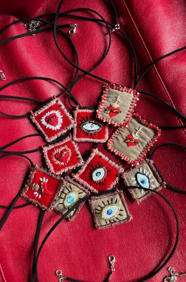 Dije bordado a mano con cordón negro de gamuza! ✨🤍🫶🏻 Accesorio único de ésta colección! Un amuleto que te acompaña en cada momento!