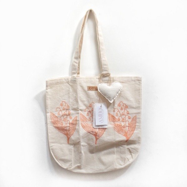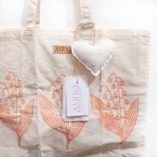 Tote bag de Lienzo crudo 100% algodón, estampado a mano, con tiras de lienzo de algodón.